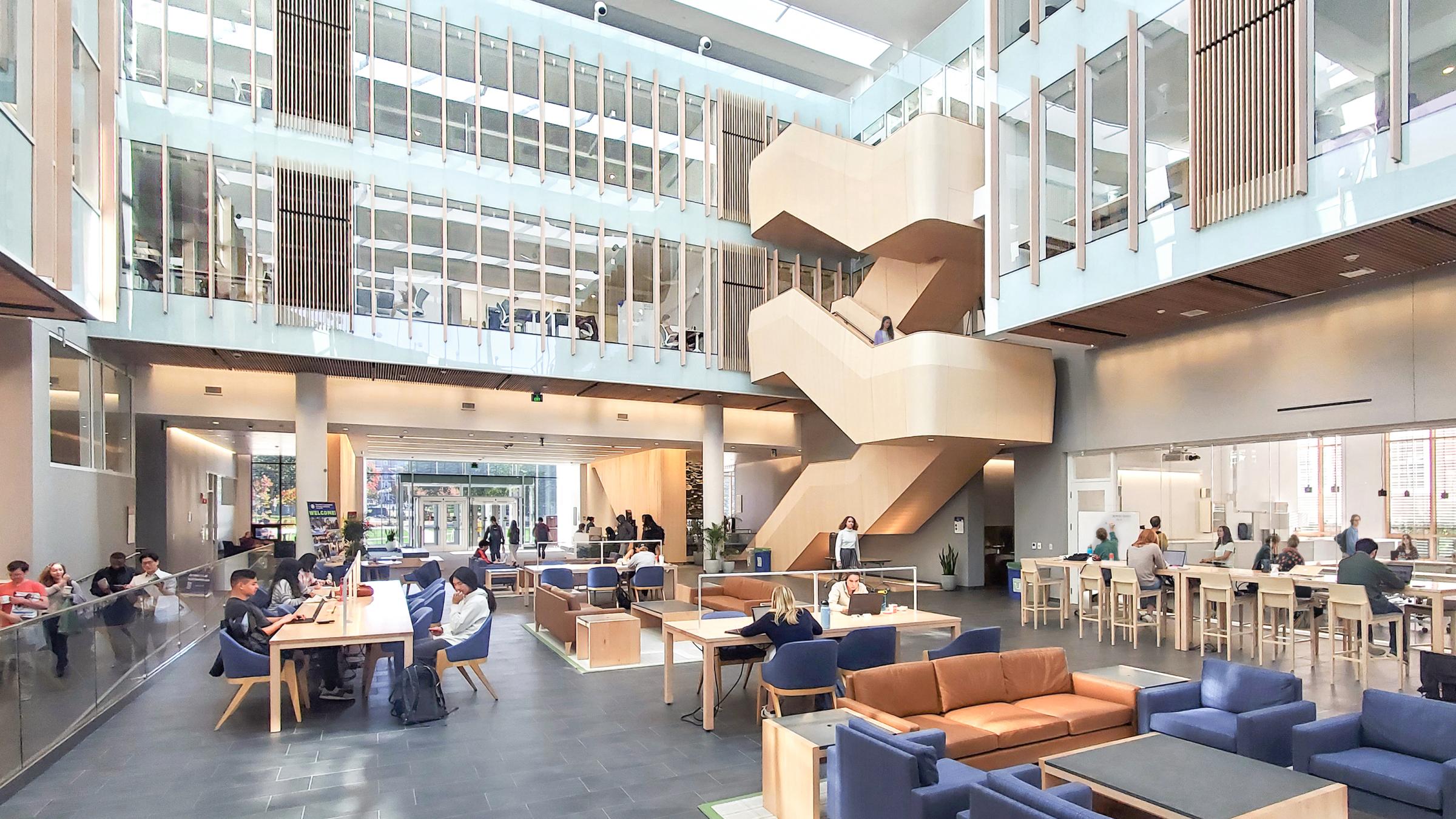 The high-performing envelope drives down heating and cooling loads, allowing the building to operate with ultra-efficient radiant ceilings throughout workspaces and a radiant slab in the large atrium space. The building’s innovative, architecturally integrated cooling and ventilation strategies will help it meet future needs, with 83% of occupied spaces being served by the automated natural ventilation system. The centerpiece of this system—a double-skin glass portico at the main entrance—echoes the campus’s traditional architecture while enhancing ventilation performance. Physically weaving together old and new structures resulted in embodied carbon savings (through material reductions) and operational carbon savings (through system upgrades) to support campuswide decarbonization goals. Other architectural components that support the natural ventilation system include the rooftop thermal vent to drive natural ventilation system, full-height dampers architecturally integrated in atrium wall, and automated awning and parallel project windows.